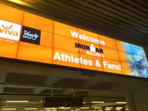 Pues ya estoy en Alcudia, Mallorca, que gran subidon he sentido al llegar al aéreopuerto y me encuentro con el luminoso de Ironmam Mallorca, no